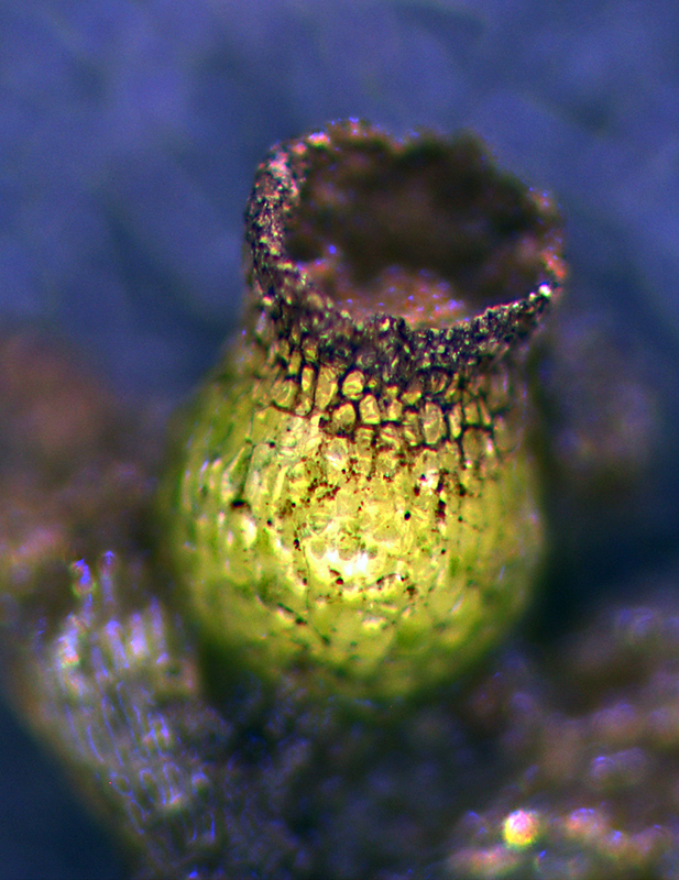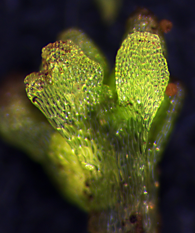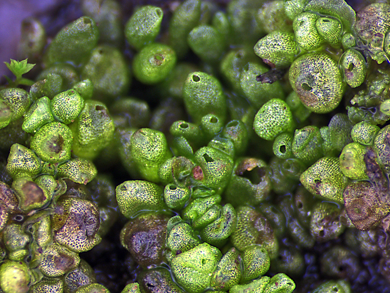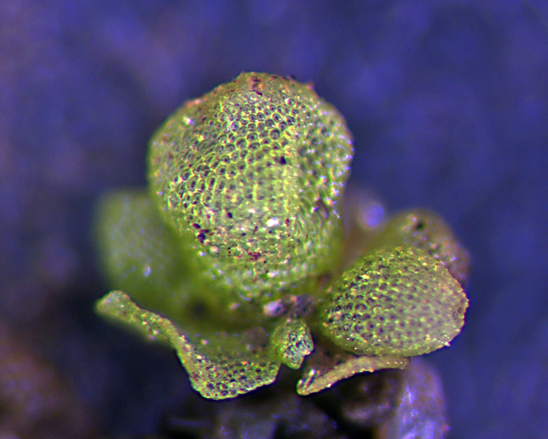 A prostrate thallus of several rounded lobes forms a sac-like structure of fused bracts (involucre) surrounding an an archegonium.