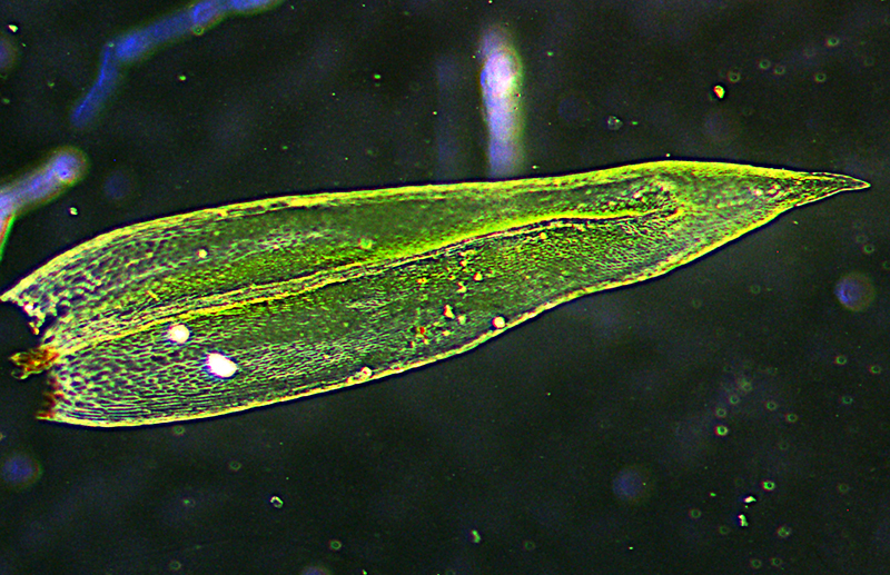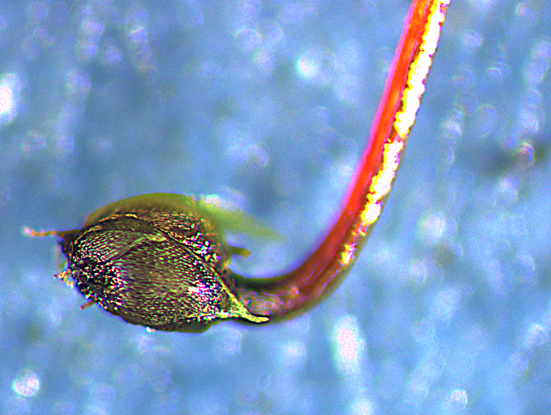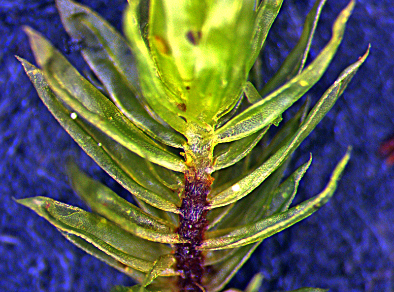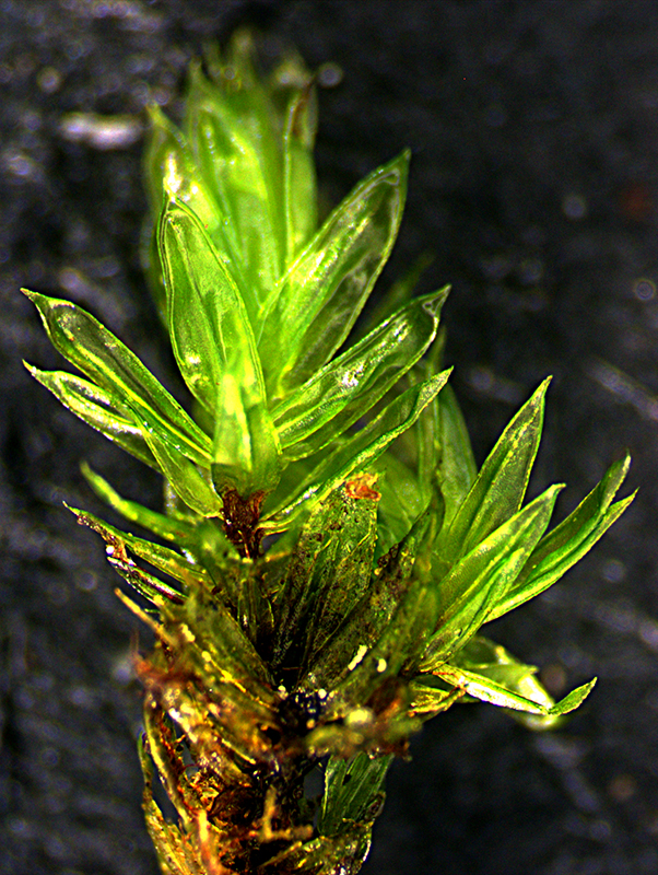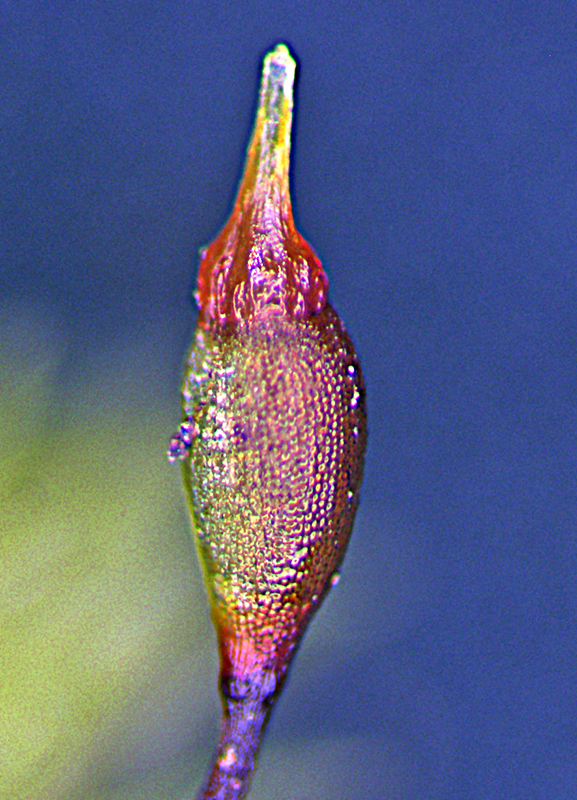 Young capsule with calyptra covering at tip of sporophyte seta (stalk).